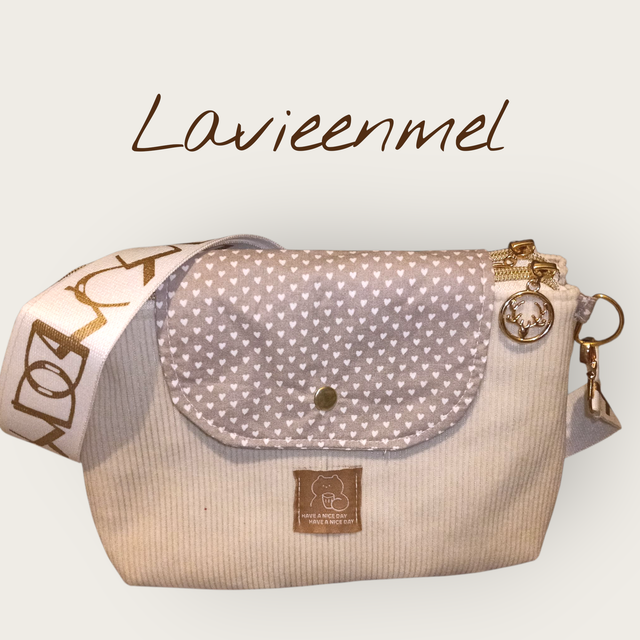 sac bandoulière double poches zippées avec une poche central fermeture rabat pression matières coton et velours.